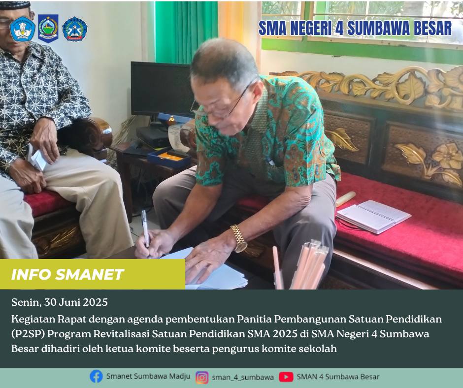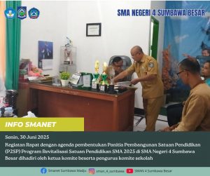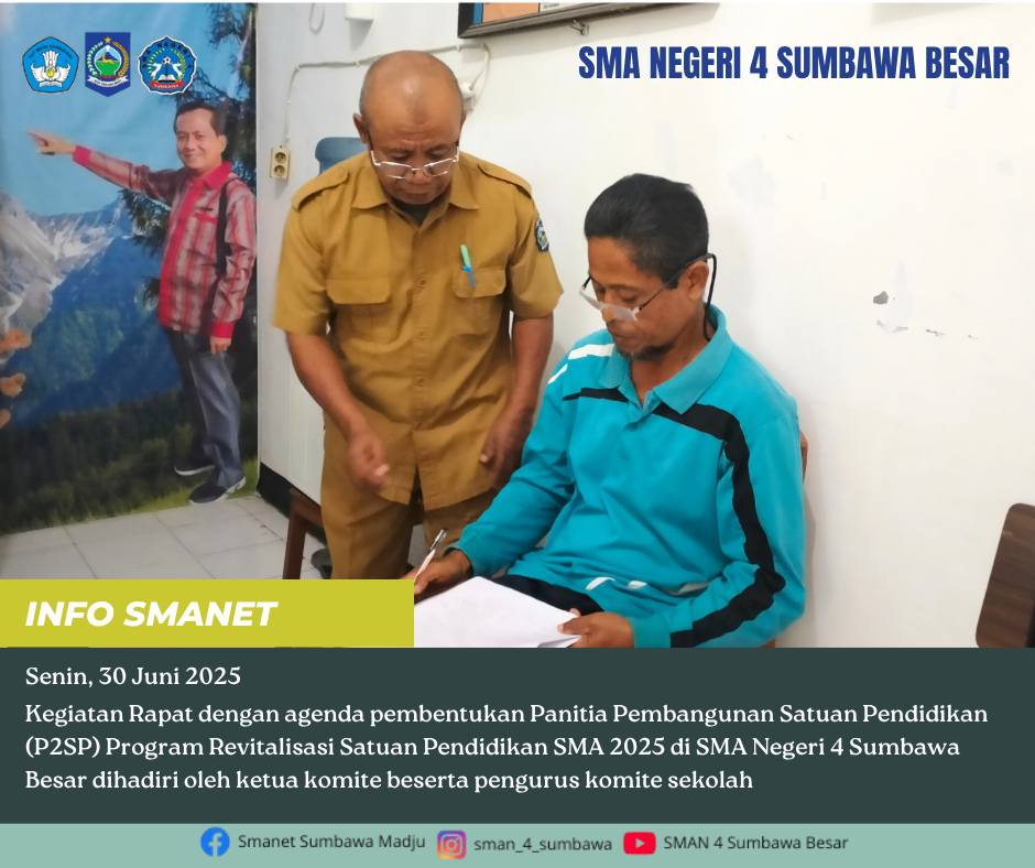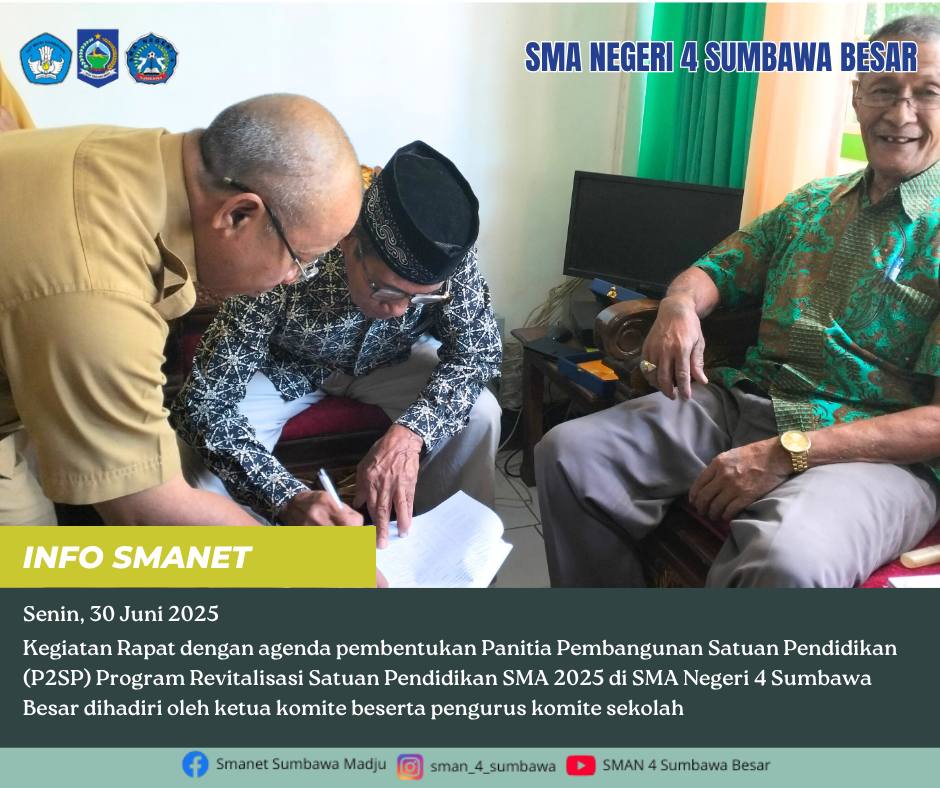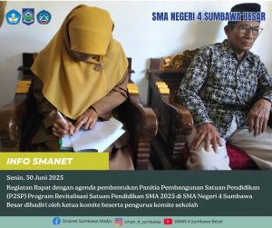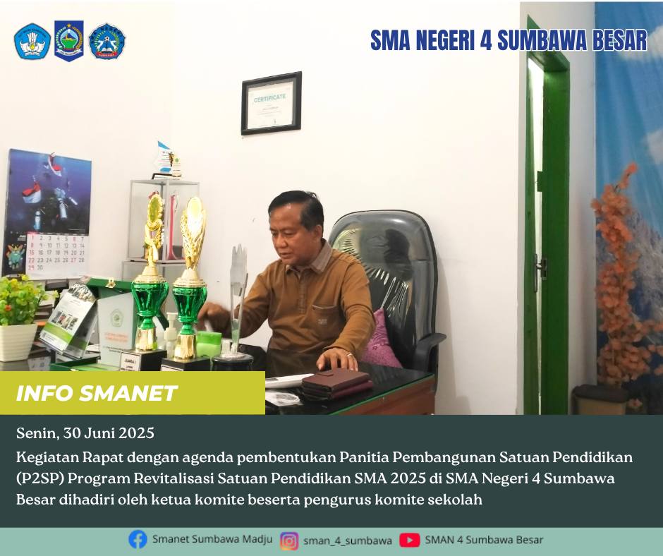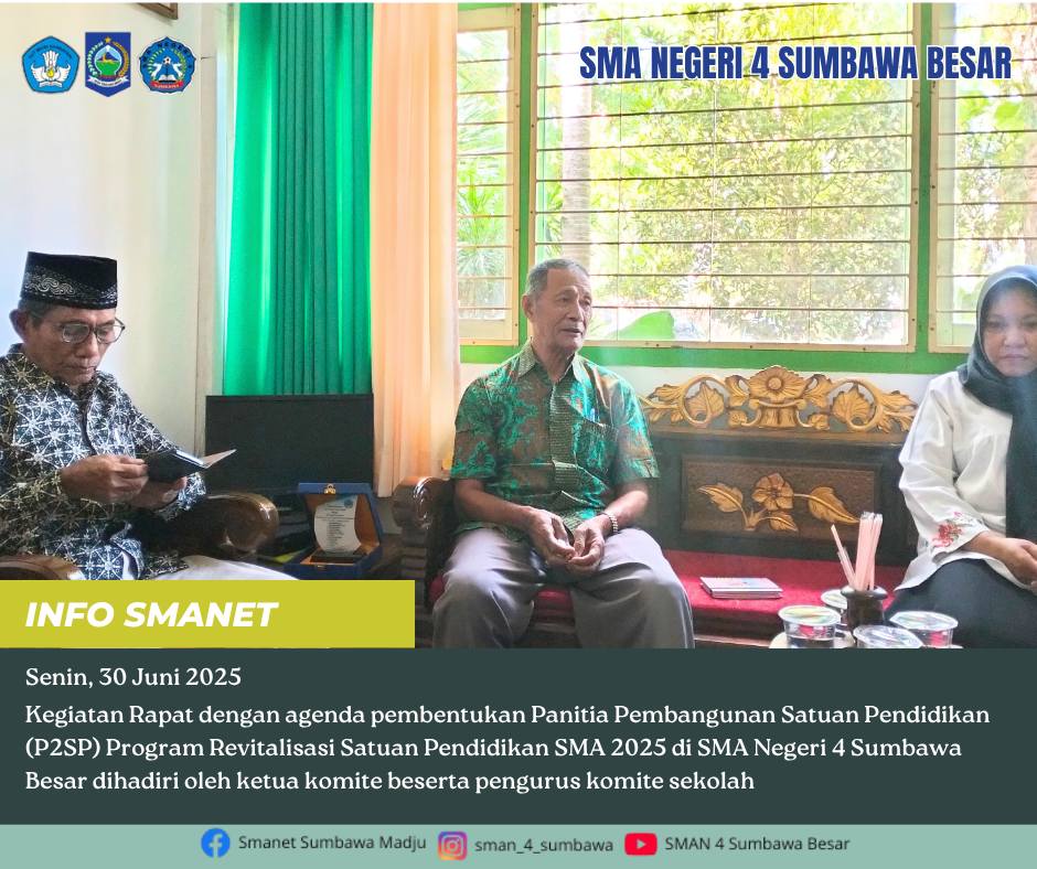 Kegiatan Rapat dengan agenda pembentukan Panitia Pembangunan Satuan Pendidikan (P2SP) Program Revitalisasi SMA 2025 di SMA Negeri 4 Sumbawa Besar dihadiri oleh ketua komite beserta pengurus komite sekolah.