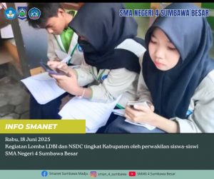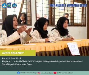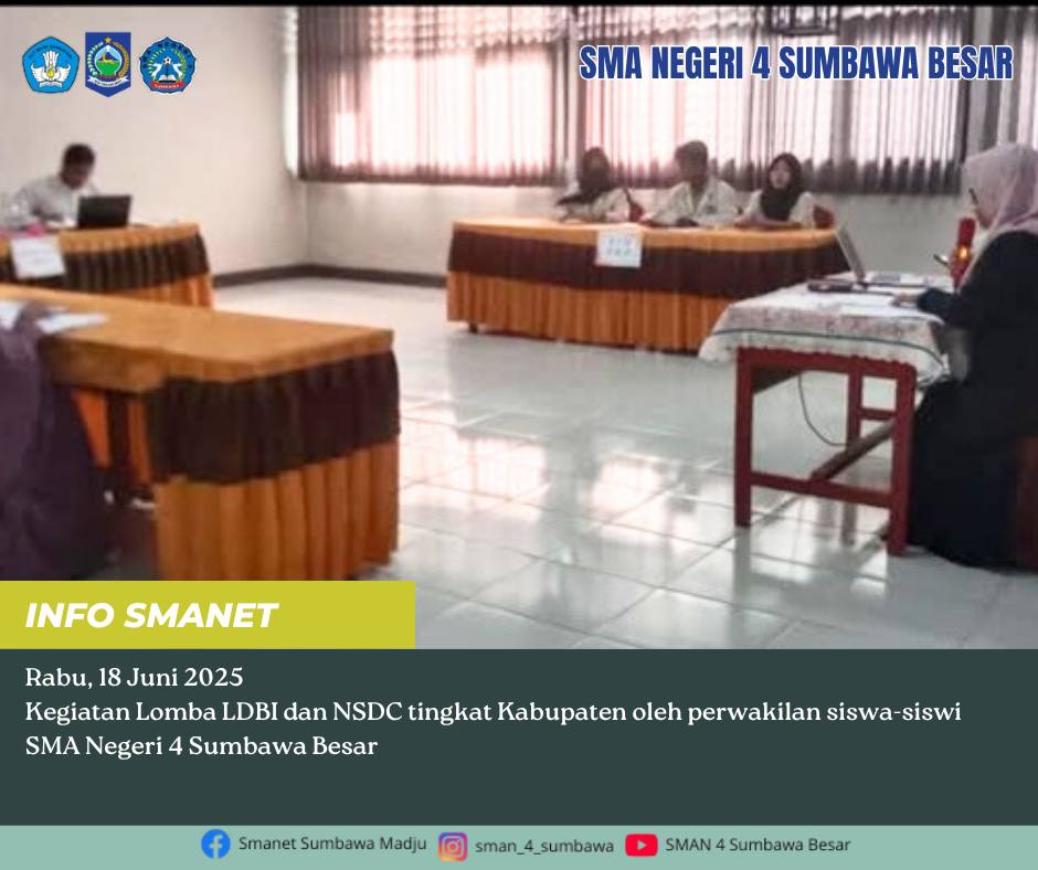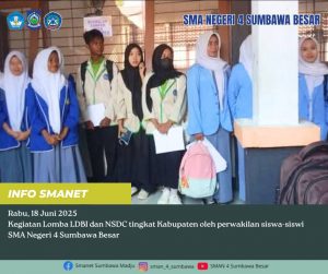 Kegiatan Lomba LDBI dan NSDC tingkat Kabupaten Sumbawa By ningsihJune 18, 2025July 19, 2025Berita Rabu, 18 Juni 2025 Kegiatan Lomba LDBI dan NSDC tingkat Kabupaten Sumbawa oleh perwakilan siswa-siswi SMA Negeri 4 Sumbawa Besar. #dikbudntb #NTBMakmurMendunia #smanetmadju #bergerakmaju #sabalongsmanet