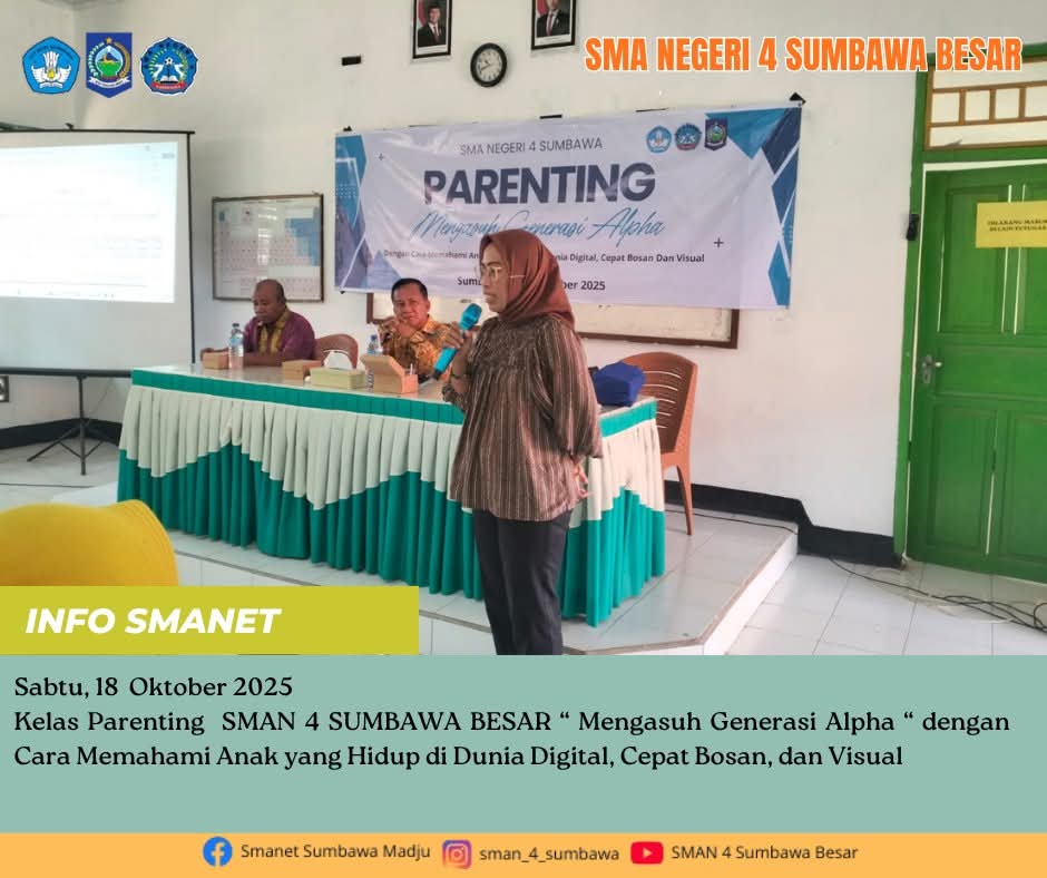 Kegiatan Parenting SMA Negeri 4 Sumbawa Besar dengan tema “Mengasuh Generasi Alpha dengan Cara Memahami Anak yang Hidup di Dunia Digital, Cepat Bosan, dan Visual” menjadi langkah nyata sekolah dalam mendukung kolaborasi pendidikan antara guru dan keluarga.