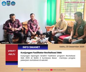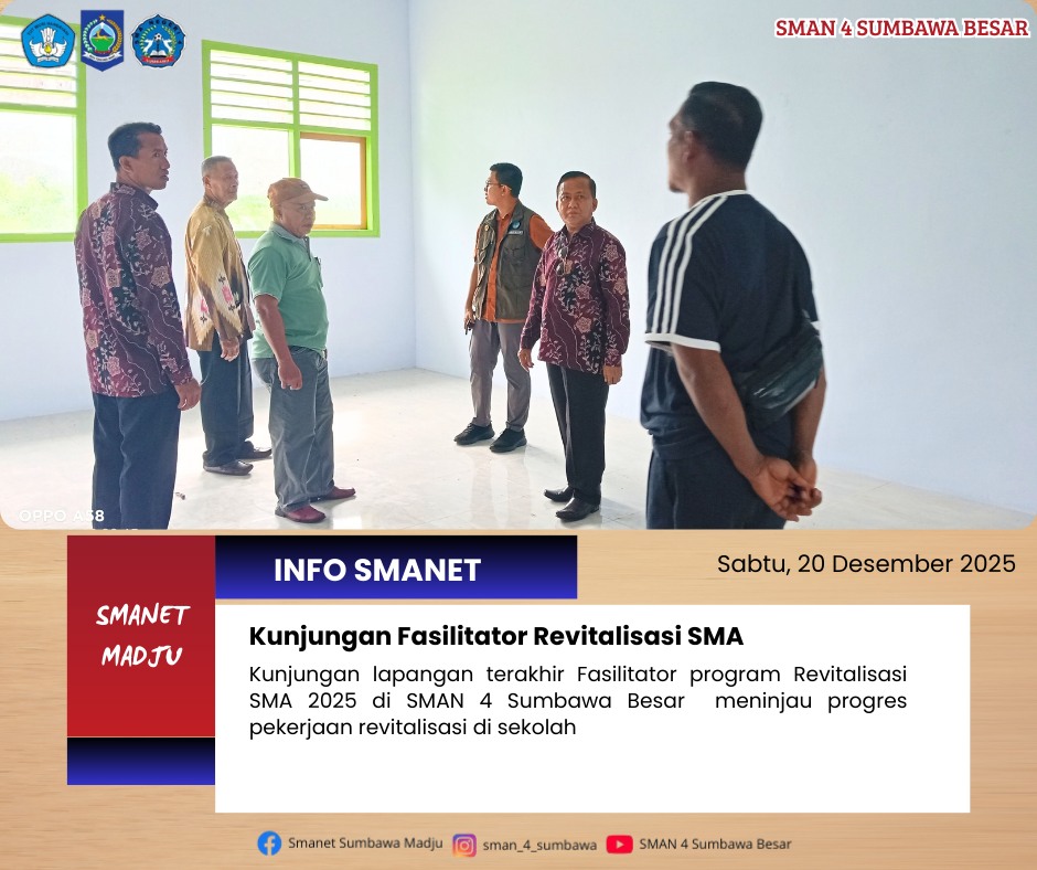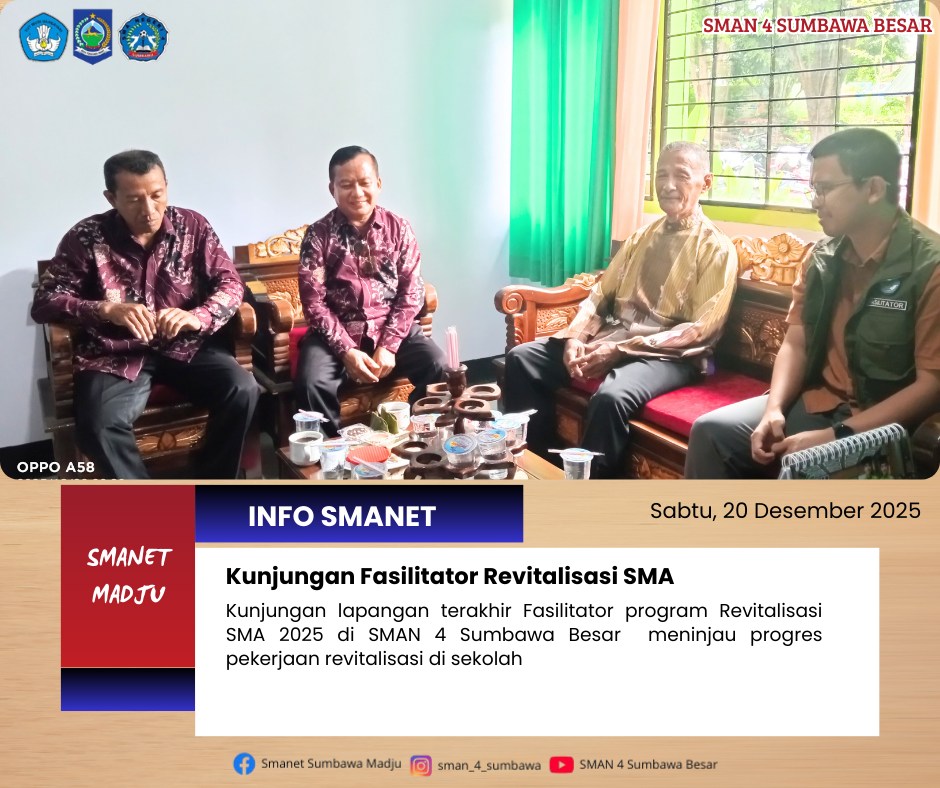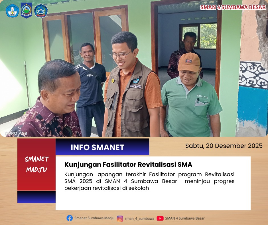 SMAN 4 Sumbawa Besar menerima kunjungan terakhir fasilitator Program Revitalisasi sebagai bagian dari monitoring dan pendampingan pelaksanaan program di sekolah. Kegiatan ini bertujuan untuk memastikan pelaksanaan revitalisasi berjalan sesuai dengan perencanaan dan ketentuan yang telah ditetapkan.
