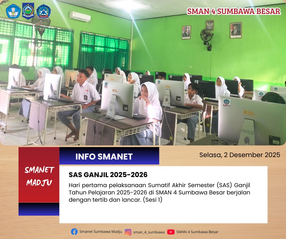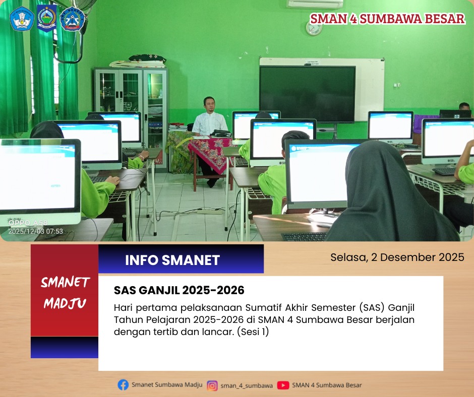 SMAN 4 Sumbawa Besar melaksanakan Penilaian Akhir Semester (PAS) Ganjil berbasis Computer Based Test (CBT) sebagai upaya meningkatkan efektivitas dan transparansi penilaian. Kegiatan ini diikuti oleh seluruh peserta didik dengan tertib dan lancar. Kegiatan PAS ini berlangsung dari tanggal 2- 8 Desember 2025.